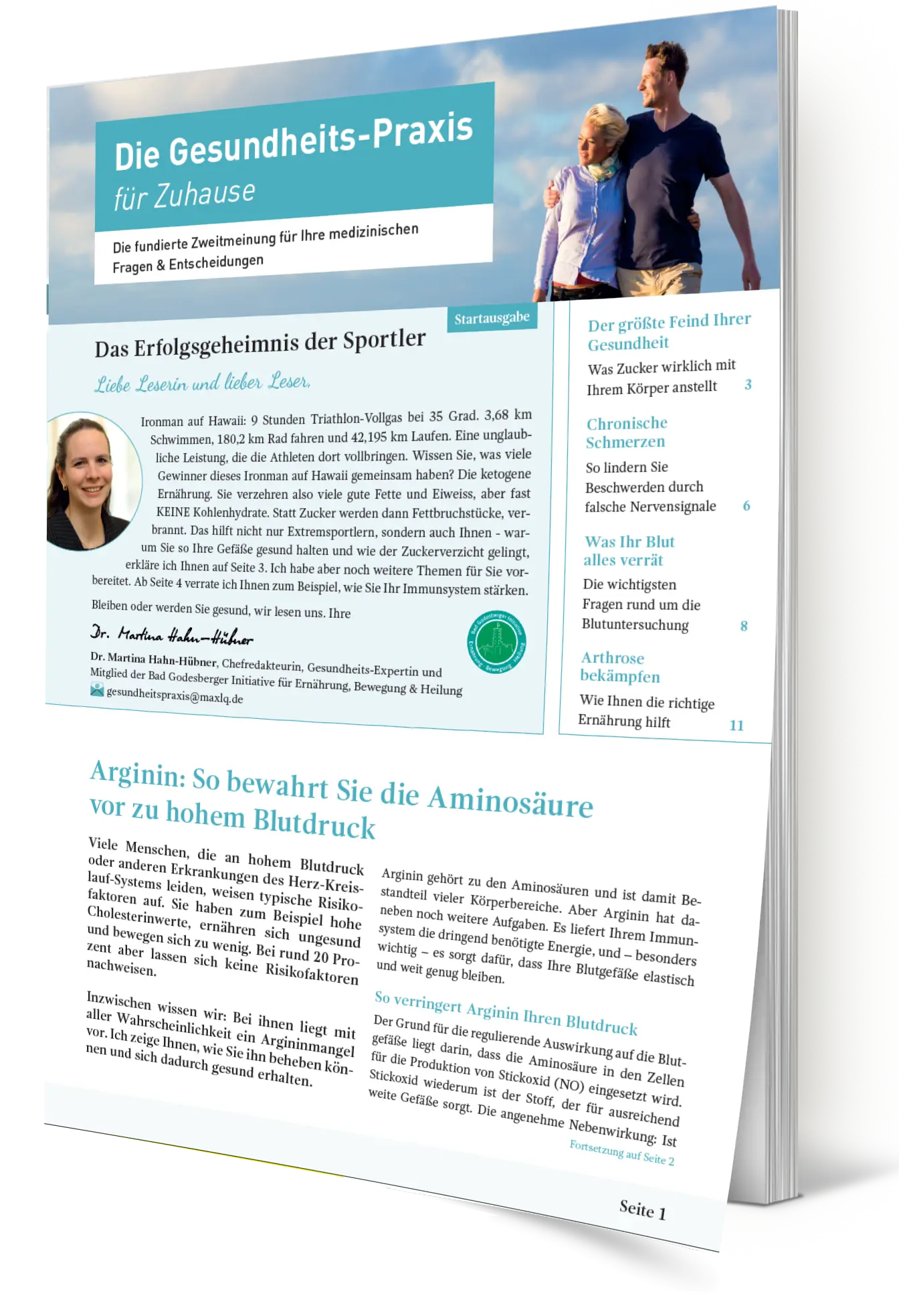 Wir bestimmen 70 % unserer Gesundheit selbst. Deshalb zeigt Ihnen Dr. Martina Hahn-Hübner in ihrem Informationsdienst Die Gesundheits-Praxis für Zuhause, was Sie selbst für ein langes Leben in Gesundheit und Vitalität tun können.